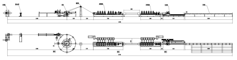 開卷→剪切對焊→臥式螺旋活套→校平→軋制成型→高頻焊接→刮刀→冷卻 →定徑→矯直 →飛鋸切料→下料輥道 |