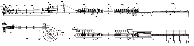 上料小車→開卷→剪切對焊→臥式螺旋活套→校平→軋制成型→高頻焊接→刮刀→冷卻 →定徑 →矯直→飛鋸切料→下料輥道 |